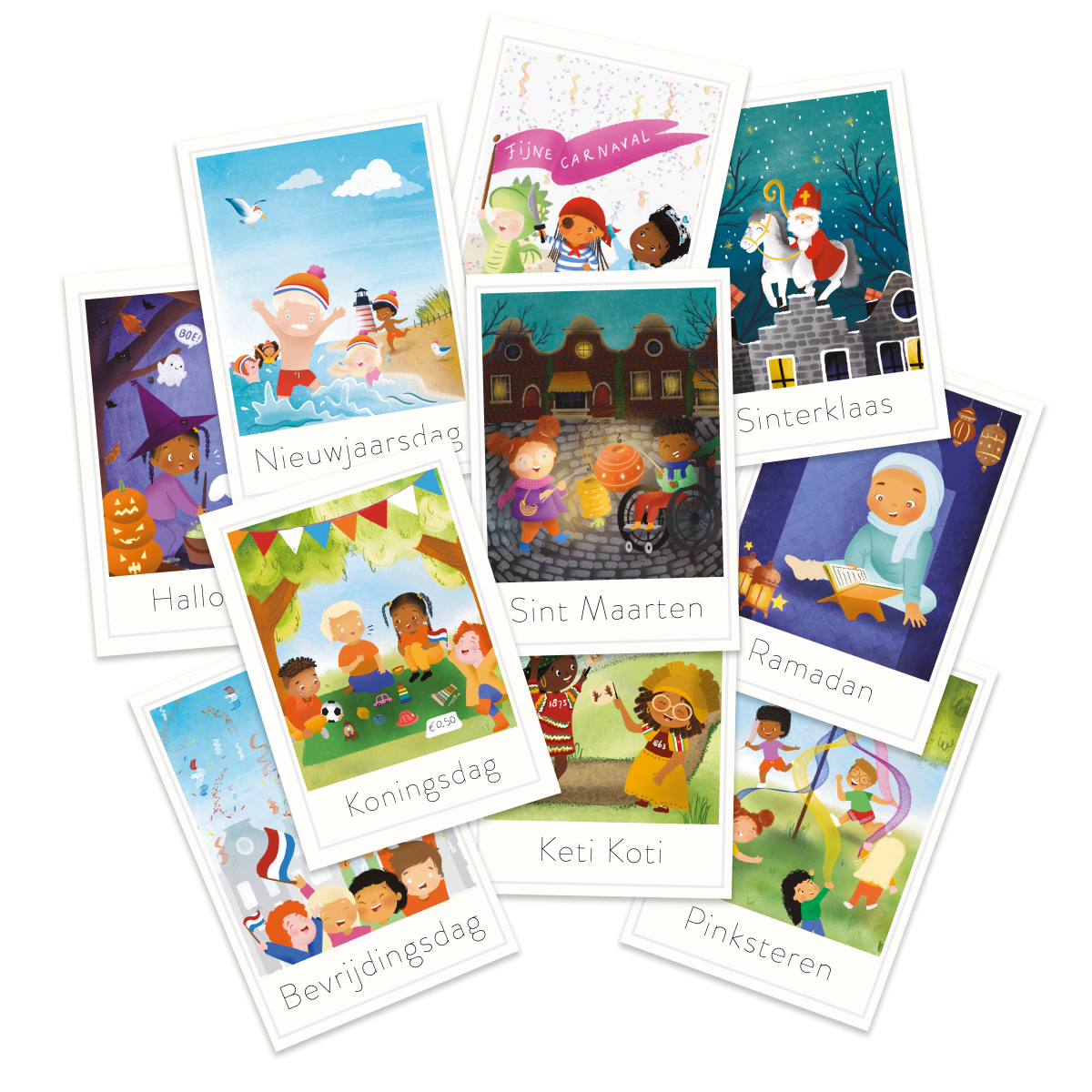 Elke maandkaart biedt een nieuwe scène die uitnodigt tot interactie en verwondering. In januari zien we kinderen spelen in de sneeuw en in oktober de warme gloed van de herfst. Deze illustraties weerspiegelen de activiteiten en elementen die bij elk seizoen horen, zoals het zaaien en oogsten, spelen in de regen, en samen de feestdagen vieren. Door deze herkenbare scènes begrijpen kinderen intuïtief de veranderingen in de natuur en het leven om hen heen.